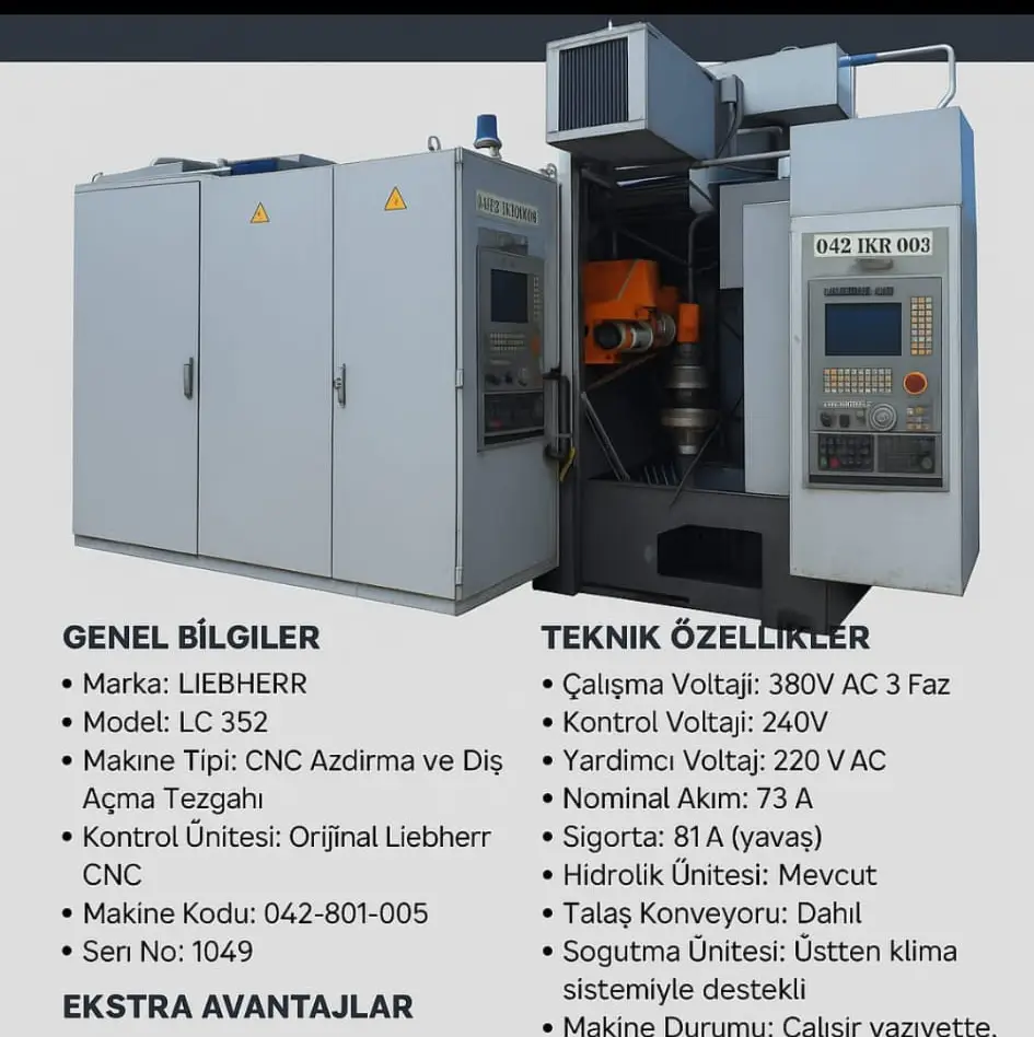 Endüstriyel dişli üretim süreçlerinde yüksek hassasiyet, stabil çalışma ve uzun ömürlü performans sunan Liebherr LC 352 CNC azdırma ve diş açma tezgahı, ileri seviye CNC kontrol teknolojisi ile donatılmış profesyonel bir üretim çözümüdür. Özellikle hassas dişli üretimi gerektiren sektörlerde tercih edilen bu model, güçlü mekanik yapısı ve yüksek işlem kabiliyeti ile üretim süreçlerini optimize eder.